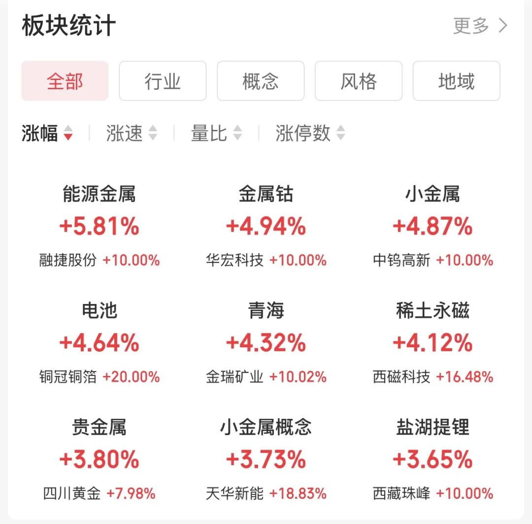 今天,有色金属概念股表现强势。其中,能源金属板块大涨5.81%,金属钴、小金属、稀土永磁、贵金属等多个板块爆发。融捷股份等多只股票掀起“涨停潮”。