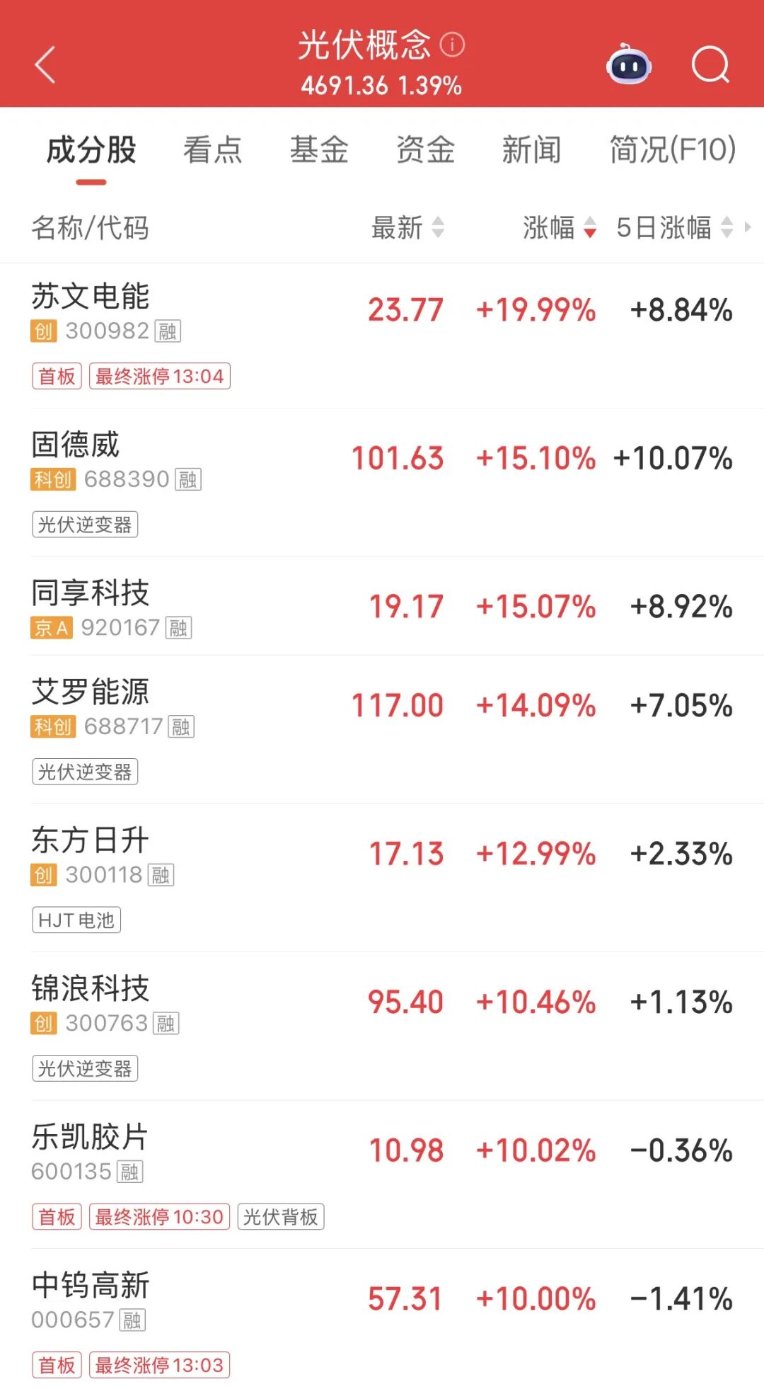 光伏概念全天表现活跃,苏文电能“20CM”涨停。