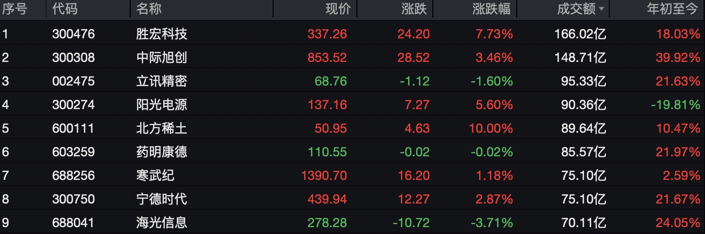 个股方面,胜宏科技半日成交额超166亿元居首,中际旭创、立讯精密、阳光电源成交额靠前。