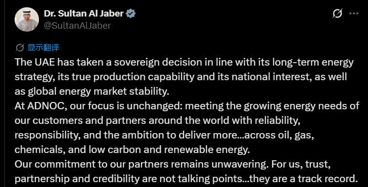 阿联酋工业与先进技术部部长、阿布扎比国家石油公司首席执行官贾比尔也表示,阿联酋做出的这一决定符合其长期能源战略、真实生产能力、国家利益以及全球能源市场稳定。阿布扎比国家石油公司的重点始终未变:以可靠、负责和雄心勃勃的态度,满足全球客户和合作伙伴日益增长的能源需求,涵盖石油、天然气、化工、低碳和可再生能源。