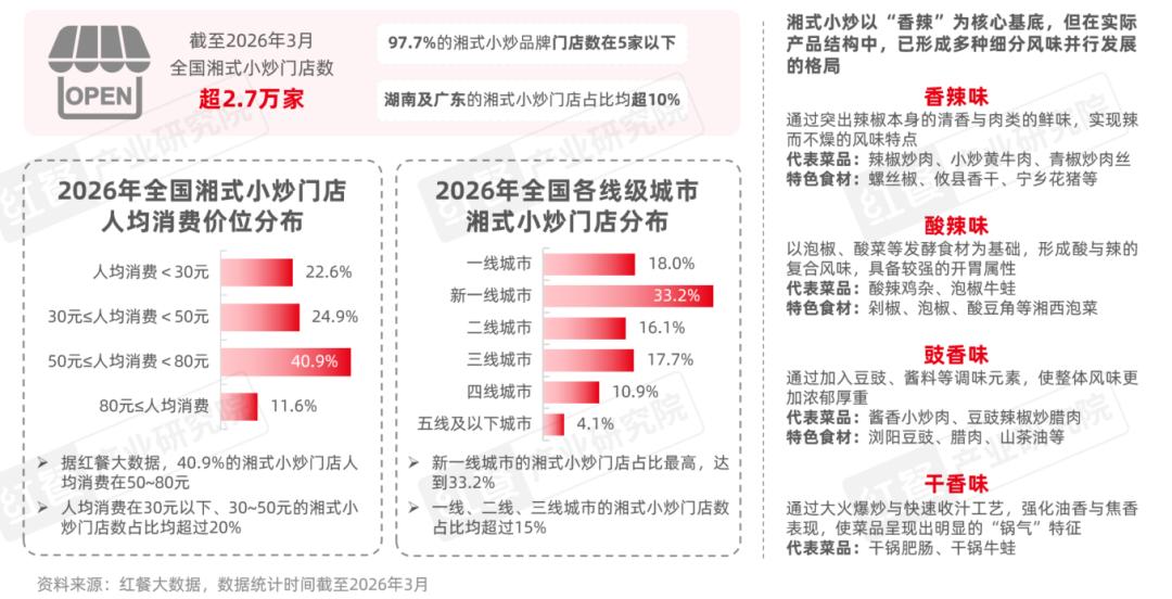 近年来,随着湘菜热度的持续走高,湘式小炒作为其中具有代表性的细分赛道之一,也在全国范围内加速扩张,整体发展势头强劲。据红餐大数据,截至2026年3月,全国湘式小炒门店数已超过2.7万家,整体规模持续扩大,但行业仍以小体量品牌为主,97.7%的品牌门店数在5家以下,呈现出高度分散的竞争格局。
