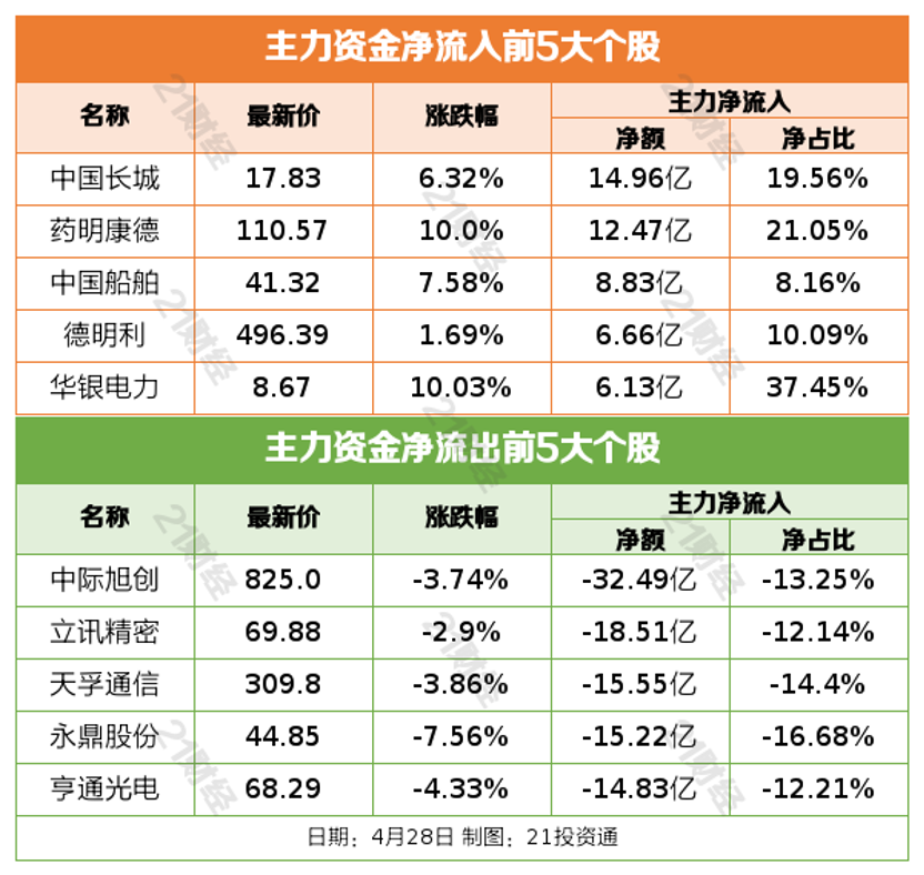 4月28日,市场全天震荡调整,三大指数低开低走,创业板指、深成指、科创50指数均跌超1%,创业板指日线走出4连阴。截至收盘,沪指跌0.19%,深成指跌1.1%,创业板指跌1.43%。沪深两市成交额2.54万亿,较上一个交易日缩量531亿。