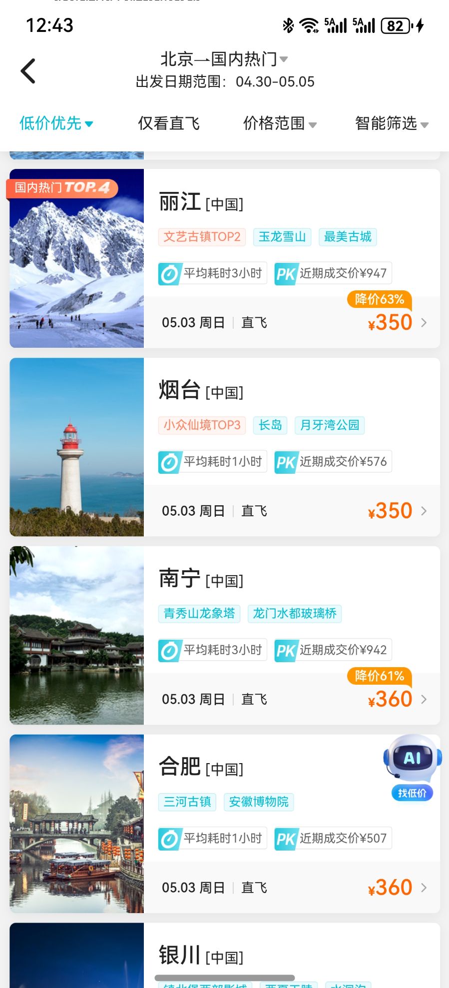 浮子的情况不是个案。小红书上不少网友都分享了自己类似的经历,多数网友都发现自己订贵了,这两日买票或订酒店,价格反而更便宜。21世纪经济报道记者在去哪儿、携程等平台搜索发现,网友们反映的机票跳水情况确实很普遍。原本高不可攀的价格,从5月2日开始都变得非常亲民。以北京出发为例,5月4日飞兰州的价格只有269元,大跌55%;5月3日飞海口则只要320元,降价68%,飞三亚也差不多,只要325元,这两个价格都不到原价的两折。