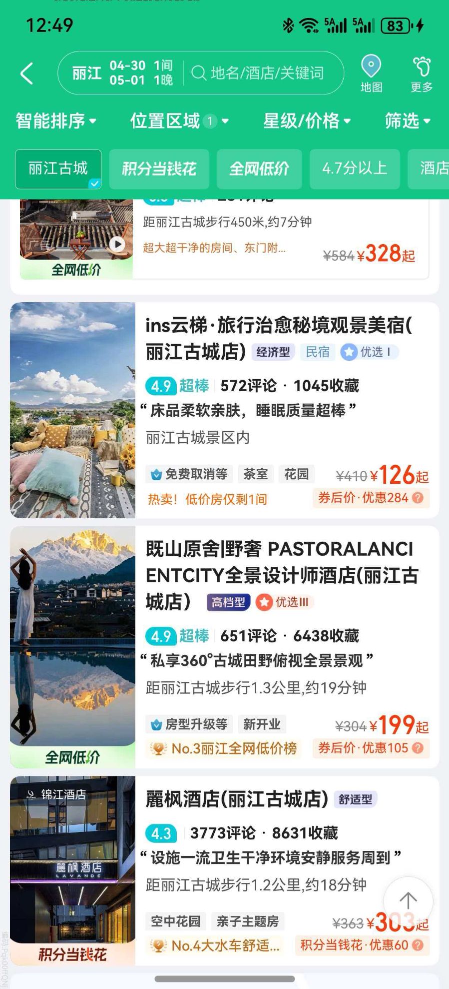 记者注意到,往年热门旅游目的地丽江,机票跳水也很明显,4月30日、5月1日机票有4.3折,5月2日迅速降至1.6折或1.7折,京沪飞过去机票不足600元。5月3日更是降至350元,降幅达63%。此外,不仅是机票便宜,丽江“五一”期间的住宿价格更是低得惊人。一堆评分4.9以上的丽江民宿和酒店,5月1日的价格只有两三百元,且都在原价基础上打折。而丽江古城里部分客栈和青旅,价格甚至低至几十元。