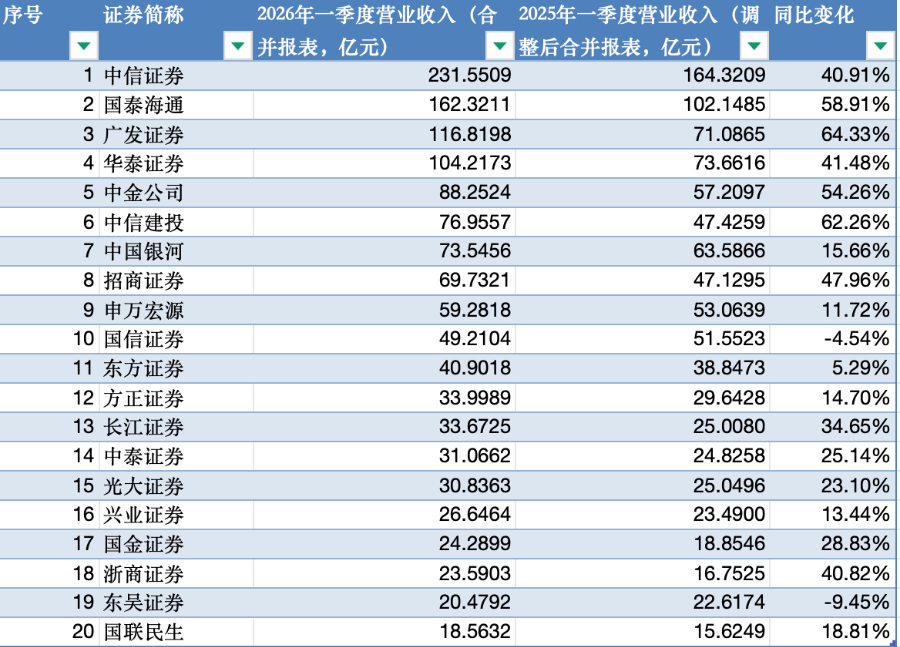 2026年一季度营业收入排名前20的上市券商