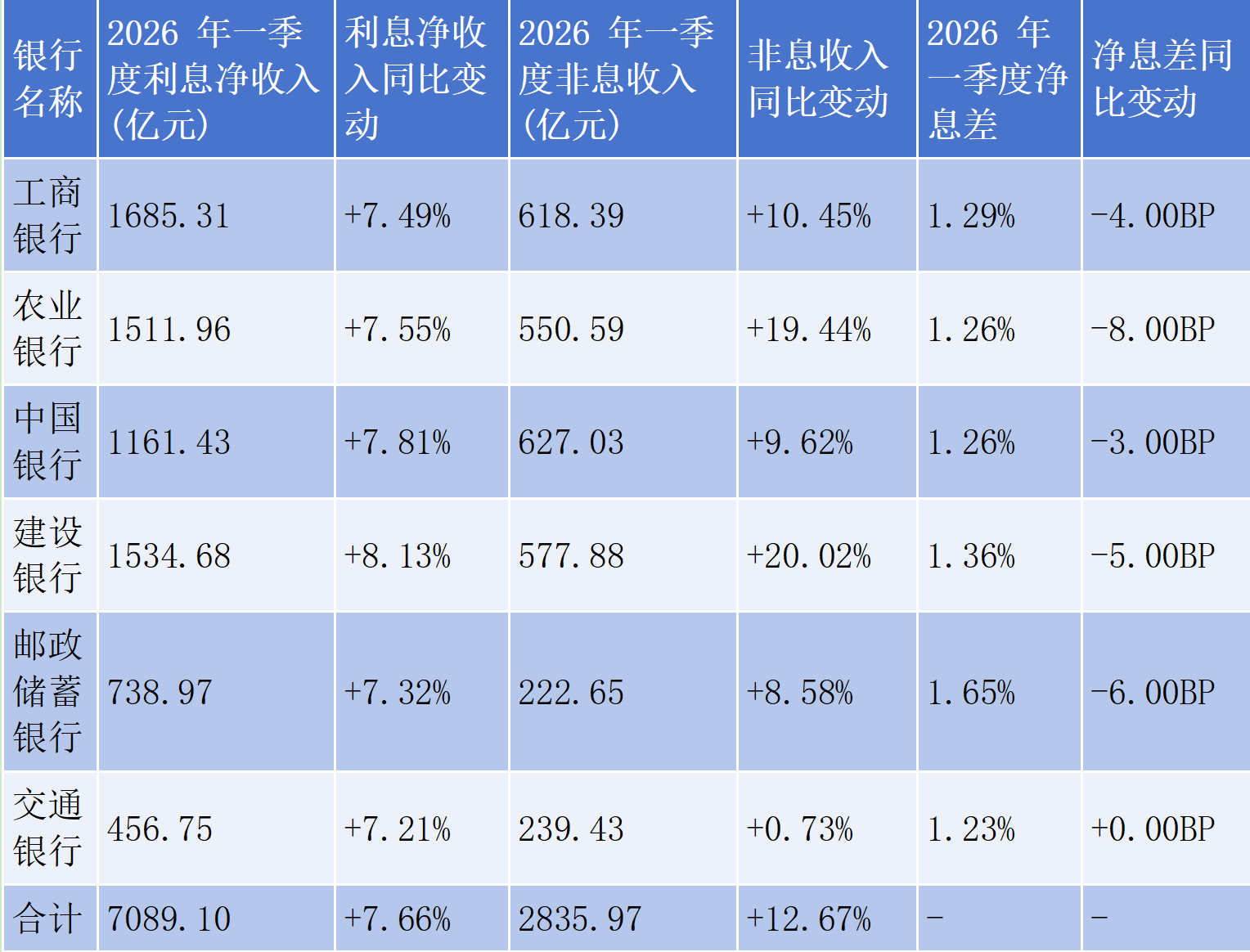 2026年一季度,六大行利息净收入合计达7089.10亿元,同比增长超过7%,其中建设银行利息净收入同比增长8.13%,增速领跑六大行,其余五家大行利息净收入增速均超7%,成为拉动营收增长的第一支柱。